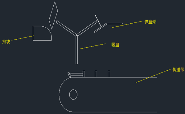 該紙盒撐開機(jī)構(gòu)的過程是:吸盤逆時(shí)針旋轉(zhuǎn)(約30°)到供盒架處,吸住紙盒的一側(cè),將其從供盒架吸出;之后吸盤帶著紙盒繼續(xù)旋轉(zhuǎn)120°,紙盒的側(cè)面碰到擋塊,在擋塊的擠壓作用下,紙盒順勢(shì)滑下,從而處于半撐開狀態(tài)。最后當(dāng)吸頭轉(zhuǎn)到傳送帶的正上方,真空吸頭通氣,釋放紙盒到傳送帶的卡槽中,運(yùn)動(dòng)中卡槽的一側(cè)將紙盒向前擠壓,使紙盒處于完全撐開狀,供后面裝入食品使用,這樣就完成了整個(gè)取盒動(dòng)作。