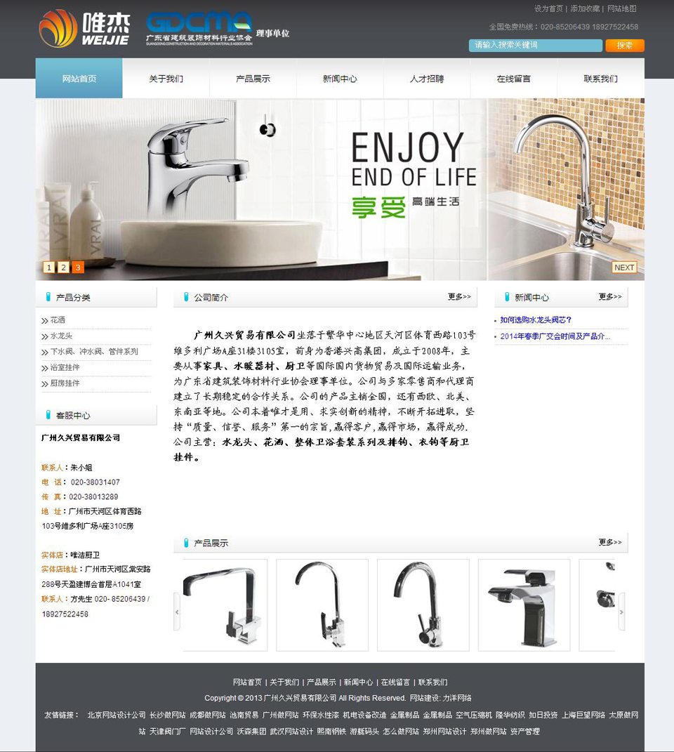 廣州久興貿易有限公司坐落于繁華中心地區天河區體育西路103號維多利廣場A座31樓3105室,前身為香港興高集團,成立于2008年,主要從事家具、水暖器材、廚衛等國際國內貨物貿易及國際運輸業務,為廣東省建筑裝飾材料行業協會理事單位。公司與多家零售商和代理商建立了長期穩定的合作關系。公司的產品主銷全國,還有西歐、北美、東南亞等地。公司本著唯才是用、求實創新的精神,不斷開拓進取,堅持“質量、信譽、服務”第一的宗旨,贏得客戶,贏得市場,贏得成功. 公司主營:水龍頭、花灑、整體衛浴套裝系列及排鉤、衣鉤等廚衛掛件。