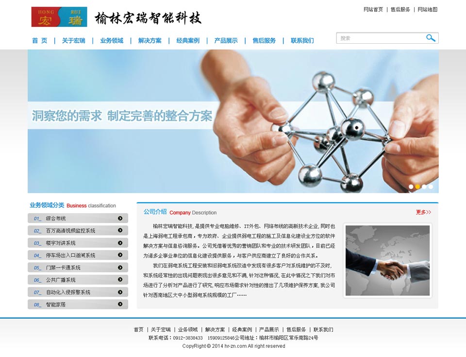 項目名稱:榆林宏瑞智能科技有限公司 簽定時間:2014-2-18 項目網址:http://www.hr-zn.com 項目簡介: 榆林宏瑞智能科技有限公司成立于2006年5月,位于常樂南路24號,注冊于榆林市工商行政管理局,注冊