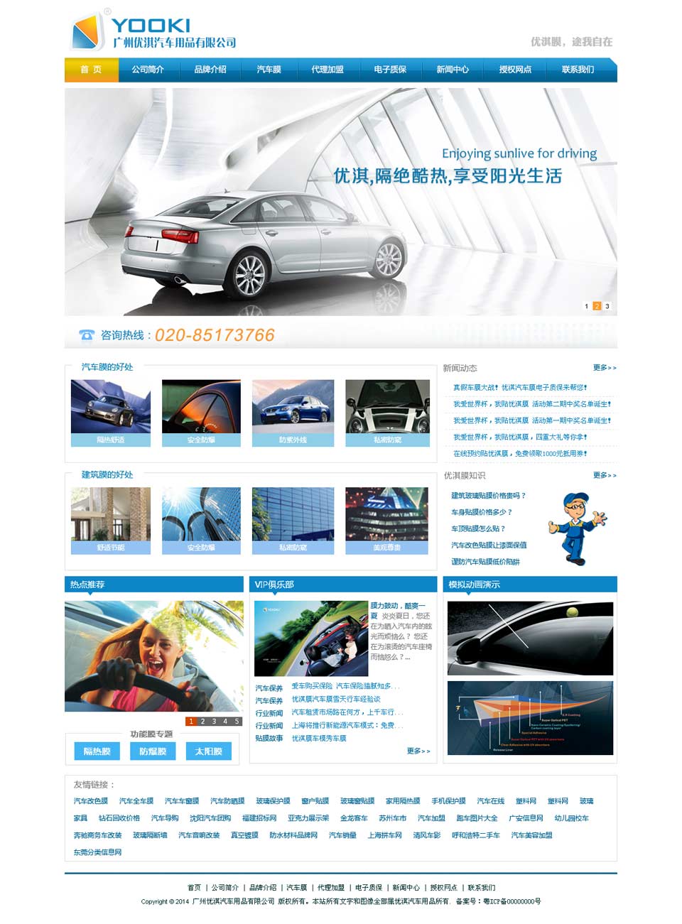 項目名稱:廣州市優淇汽車用品有限公司 簽定時間:2014-3-1 項目網址:http://www.yooki.com.cn 項目簡介: 廣州市優淇汽車用品有限公司原材料由美國專業防爆膜公司生產制造,榮獲美國能源部門頒獎表揚,