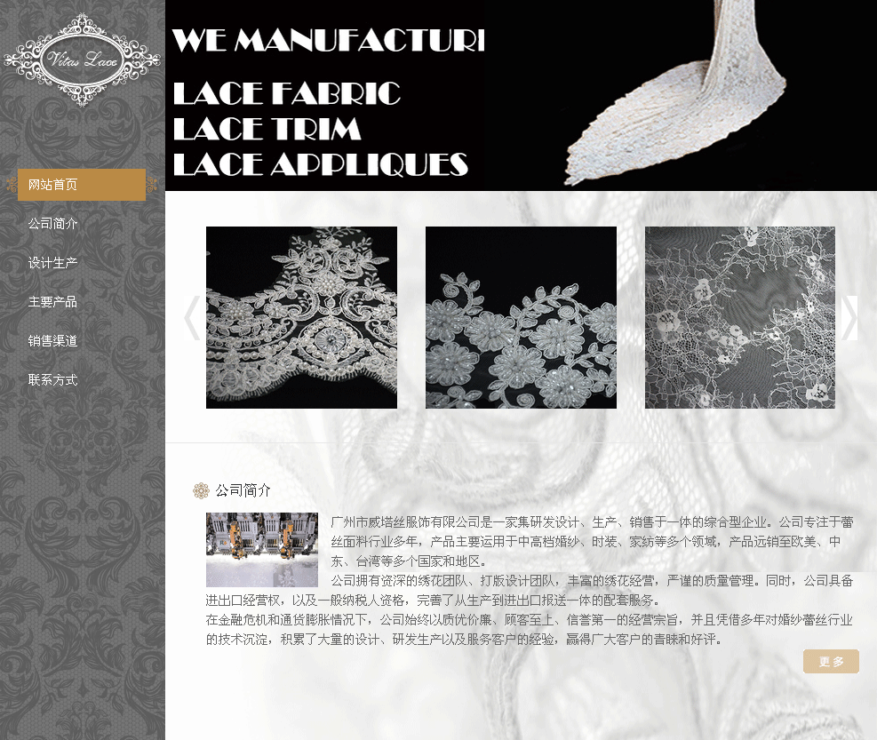 廣州市威塔絲服飾有限公司是一家集研發設計、生產、銷售于一體的綜合型企業。公司專注于蕾絲面料行業多年,產品主要運用于中高檔婚紗、時裝、家紡等多個領域,產品遠銷至歐美、中東、臺灣等多個國家和地區。