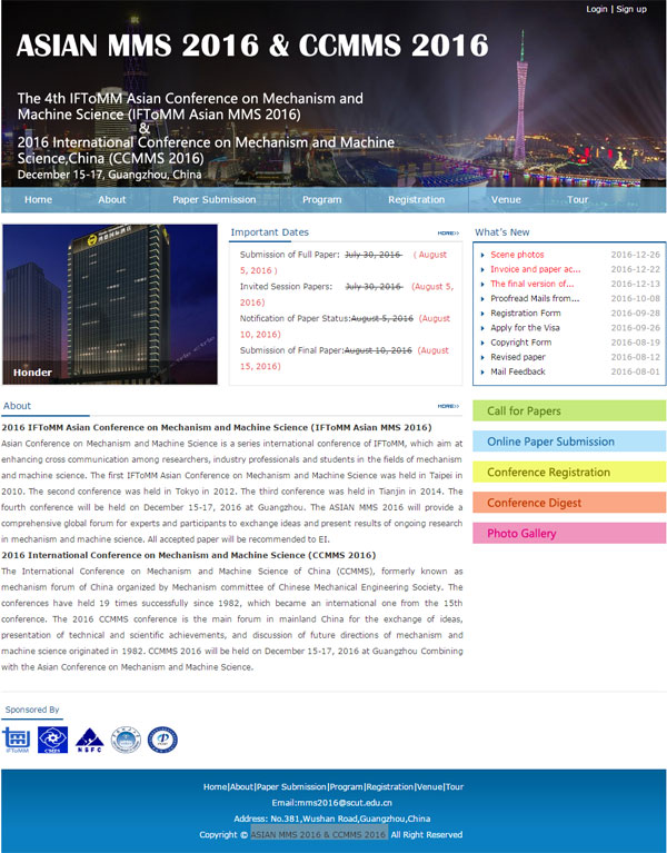項目名稱:ASIANMMS2016&CCMMS2016做網站 簽訂時間:2019-2-25 項目網址:www.ismnm.org 公司簡介: 2016IFToMMAsianConferenceonMechanismandMach