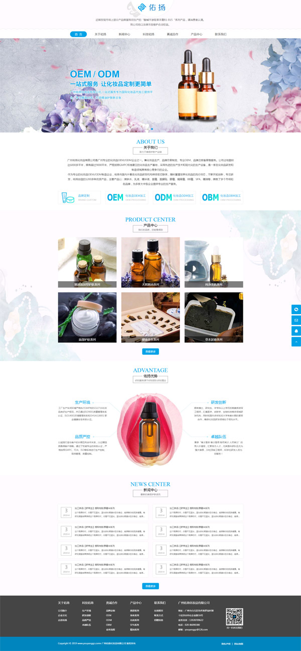 項目名稱:廣州佑揚化妝品有限公司建網站 項目網址:www.youyanggz.com 公司簡介: 廣州佑揚化妝品有限公司是廣州專業的化妝品OEM/ODM企業之一。集化妝品生產、品牌方案制定、專業OEM、品牌注冊備案等服務。公司占地面積