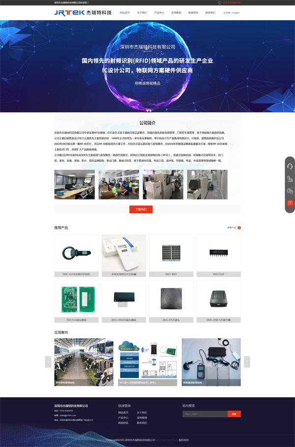 項目名稱:深圳市杰瑞特科技有限公司做網站 設計稿: 深圳市杰瑞特科技有限公司專業從事RFID領域,芯片及各式讀卡器的開發以及整合,為國內領先的畜牧業管理,門禁停車場管理,地下物聯網方案的供應商。公司主要以銷售及設計電子元器件為主要營業