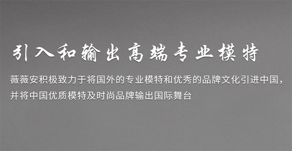 隨著業務的發展,薇薇安開始為眾多的國內外品牌定制專屬拍攝,時裝及新品發布會,深得客戶好評服務過的品牌包括:阿迪達斯、耐克、佐丹奴、寶獅龍、歌莉雅、彪馬、沃爾沃、駱駝、歐時力、七匹狼、凱樂石、路卡迪龍、多喜愛、南極人、飛利浦、穗寶,假日酒店、安佳、雀巢咖啡、日產、日產、Land Rover、Five Plus、Oppo、Escada Sport、G2000、Disney等品牌。公司于2017年成立了專屬的攝影制作部門,活動策劃部門及產品研發部門。其業務范圍已由模特代理、模特培訓發展為公關策劃、品牌推廣、廣告創意、表演制作、舞美設計施工、網絡信息發布以及組織承辦大型系列文化推廣活動等,是一家管理規范、服務高效、具有資深運作經驗的國際化、現代化綜合型文化企業。