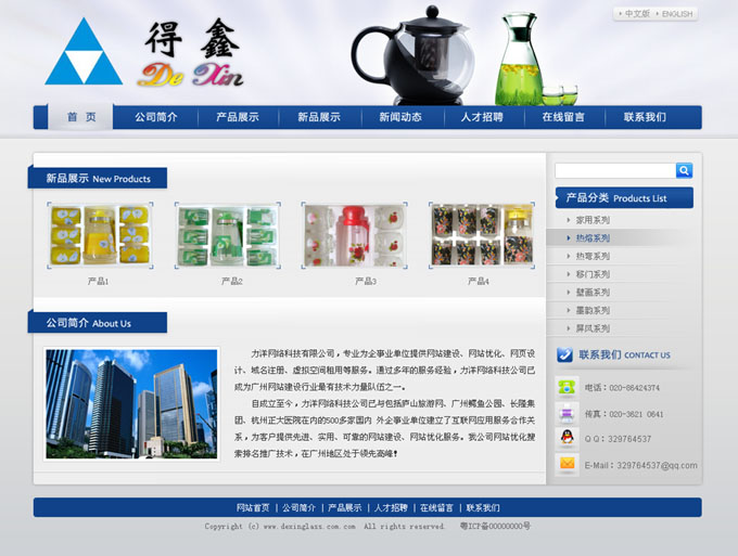 項目名稱:得鑫玻璃加工廠網站建設簽定日期:2010年12月17日廣州市白云區得鑫玻璃加工廠是一家專業生產及供應日用玻璃器皿的工貿型企業,創建于1999年,總廠位于廣州市白云區,分廠位于湖北省孝感市。廠房、倉庫建筑面積達10000平方米,擁有