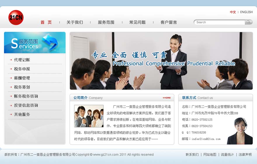 項目名稱:廣州市二一熹恩企業管理服務有限公司網站建設簽定日期:2011年1月28日公司簡介:廣州市二一熹恩企業管理服務有限公司是一家為中國和外國客戶提供各種財稅服務的專業咨詢公司。我們的團隊均由在財務、稅務、企業管理咨詢等領域從業多年并擁有