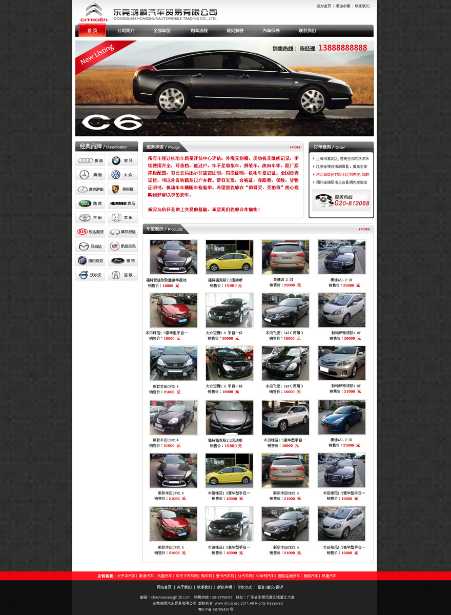 項目名稱:東莞鴻順汽車貿易有限公司網站建設簽定日期:2011年9月21日網站首頁效果圖(縮略圖):公司簡介:本公司建立于2000年,已有十多年的售車經驗,是一個集二手車收購、銷售、新舊置換、信息咨詢、車售服務、經紀事務、評估保險多功能的二手