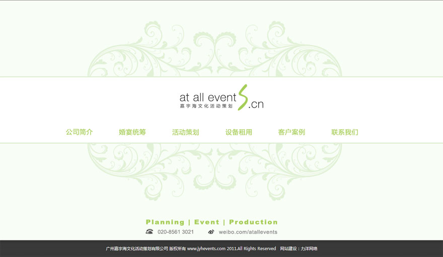 項目名稱:廣州嘉宇海文化活動策劃有限公司網站建設簽定日期:2011年11月3日注冊網址:www.atallevents.cn公司簡介:廣州嘉宇海文化活動策劃有限公司(atallevents)是一家致力于活動策劃、公關策劃、文化創意、品牌推廣