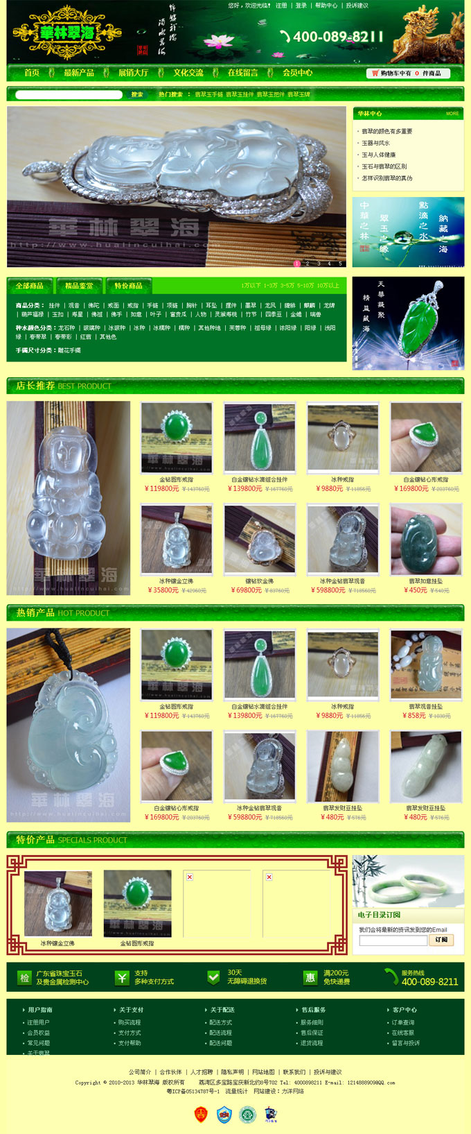 項目名稱:華林翡翠網站建設簽定日期:2011年12月6日網址:http://www.hualincuihai.com/華林翠海股份有限公司成立于2008年以著名的華林玉器街為依托,成長于充滿古典魅力與現代活力的廣州市。專門經營各種翡翠飾品: