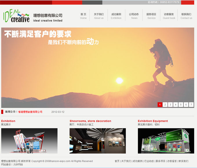 項目名稱:漢森展覽有限公司網站建設簽定日期:2011年12月20日網址:http://www.ideal-hk.com/漢森展覽有限公司是一家專業的展覽製作公司,服務範圍以大型展覽會組織、展覽展示設計及工程建造、商業會議活動與策劃、陳列室裝