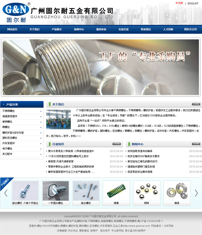 項目名稱:廣州固而耐五金有限公司網站建設簽定日期:2012年2月11日網址:http://www.guernai.com廣州固爾耐五金有限公司專業從事不銹鋼螺絲,不銹鋼螺母,螺紋護套,緊固件及工業配件服務,我們已積累超過十年以上的專業服務經