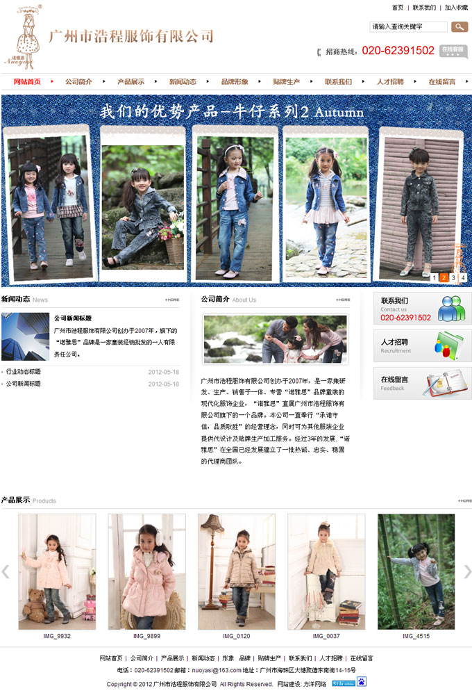 項目名稱:廣州市浩程服飾有限公司網站建設簽定日期:2012年5月3日網址:http://www.nuoyasi.com.cn廣州市浩程服飾有限公司創辦于2007年,是一家集研發、生產、銷售于一體、專營“諾雅思”品牌童