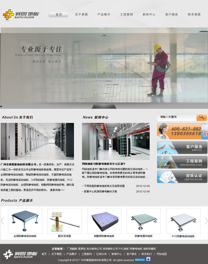 項目名稱:廣州市賽圖裝飾材料有限公司網站建設簽定日期:2012年5月23日網址:http://www.gzsaitu.com 廣州市賽圖裝飾材料有限公司,系一家集研發、生產、銷售及設計施工為一體的多元化專業防靜電地板制造商。賽圖專注產品有