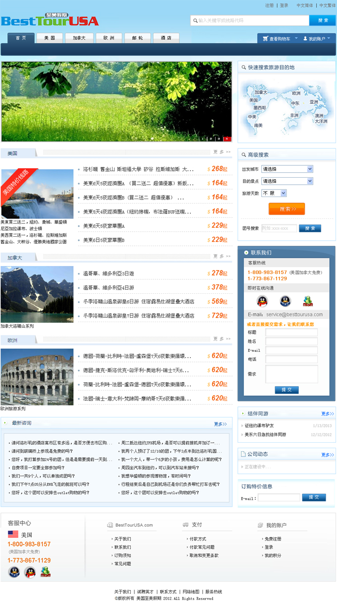 項目名稱:美國至美假期網站建設簽定日期:2012年7月12日網址:http://www.besttourusa.com美國至美假期BestTourUSA是一家在美國登記注冊的旅游公司,目前公司的核心業務是承接北美地區旅游以及商務考察,主要提