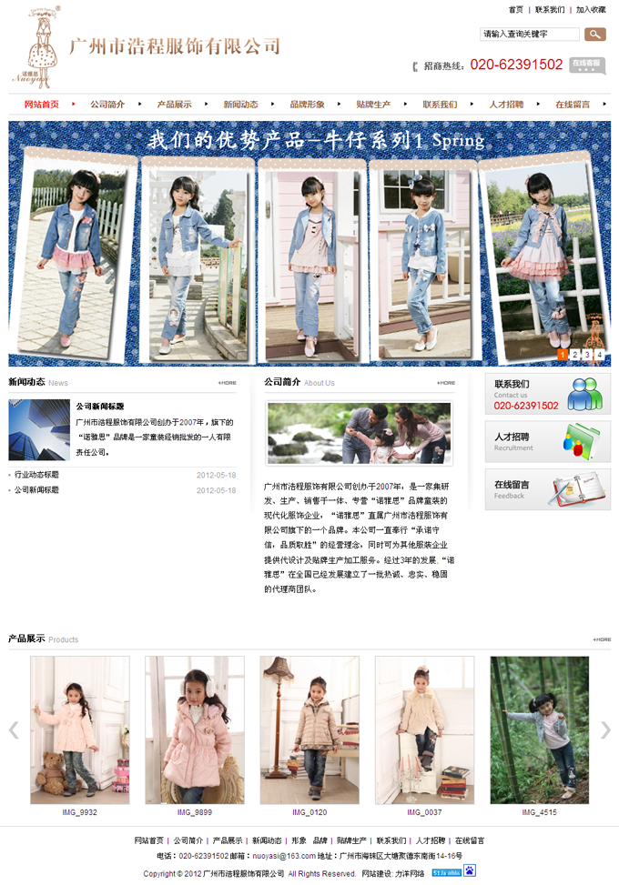 項目名稱:廣州市浩程服飾有限公司網站建設簽定日期:2012年8月20日網址:http://www.nuoyasi.com.cn/廣州市浩程服飾有限公司創辦于2007年,是一家集研發、生產、銷售于一體、專營“諾雅思”品