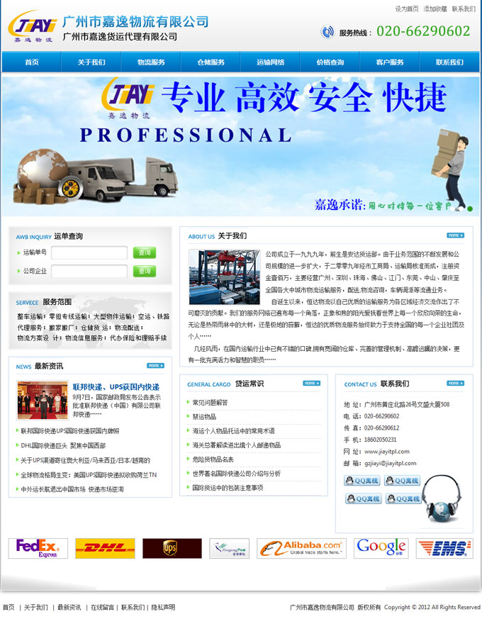 項目名稱:廣州嘉逸貨運代理網站建設簽定日期:2012年11月21日網址:http://www.jiayitpl.com嘉逸貨運代理公司成立于一九九九年,前生是安達貨運部。由于業務范圍的不斷發展和公司規模的進一步擴大,于二零零九年經市工商局、
