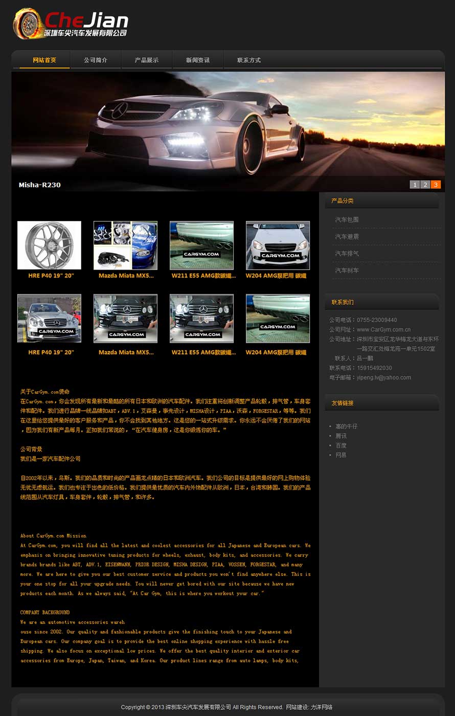 項目名稱:深圳車尖汽車發展有限公司網站建設簽定日期:2013年2月25日網址:http://www.cargym.com.cn/在CarGym.com,你會發現所有最新和最酷的所有日本和歐洲的汽車配件。我們注重將創新調整產品輪轂,排氣管,車