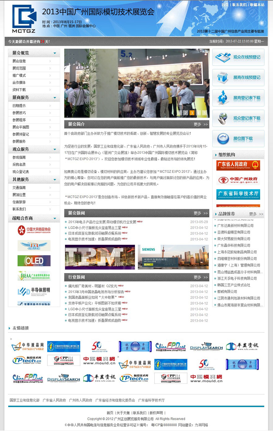 項目名稱:廣州正創展覽服務有限公司網站建設簽定日期:2013年4月9日網址:http://www.mctexpo.com2013中國廣州國際模切技術展覽會首個由政府部門主辦并致力于推廣模切技術的低碳、創新、智慧發展的專業展覽及會議!為促進行