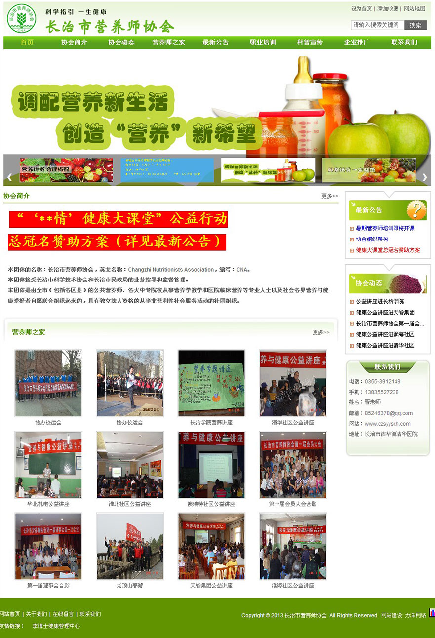 項目名稱:長治市營養師協會網站建設簽定日期:2013年6月15日網址:http://www.czsyysxh.com本團體接受長治市科學技術協會和長治市民政局的業務指導和監督管理。本團體是由全市(包括各區縣)的公共營養師、各大中專院校從事營