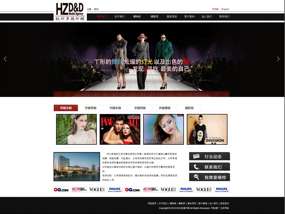 項目名稱:杭州多德外籍模特經紀公司 簽定時間:2013-10-10 項目網址:http://www.ddmodelagency.com/ 項目簡介: 杭州多德文化藝術策劃有限公司旗下多德模特經紀是一家專業外籍模特經紀公司,擁